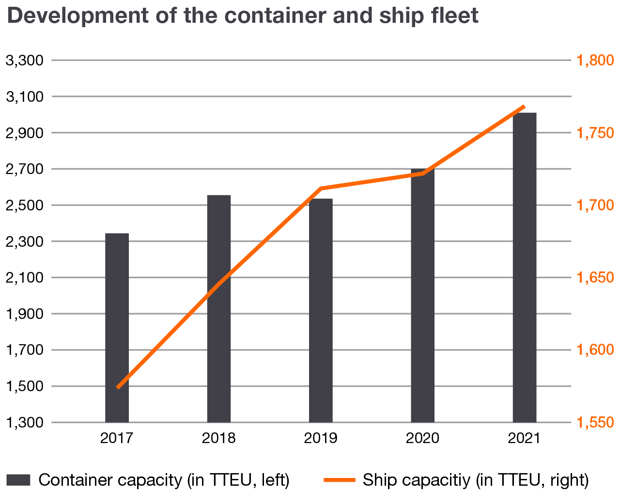 With 253 modern container vessels and a transport capacity of 1.8 million TEU, as well as containers with a capacity of 3.1 million TEU, we are there for our customers worldwide. We continued to invest in our fleet in the reporting year and ordered six more modern dual-fuel large container vessels, each with a capacity of 23,500+ TEU. We will take delivery of a total of twelve of these highly efficient vessels in 2023 and 2024, contributing to the modernisation of our fleet. Concurrently, we have ordered ten more 13,000 TEU vessels to grow our order book to a capacity of over 400 TTEU. We also continued to build up our container capacity and purchased or leased approximately 300 TTEU of additional capacity in the 2021 financial year to meet our customers’ demand. We also invested in attractive niche markets such as refrigerated and special containers.